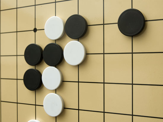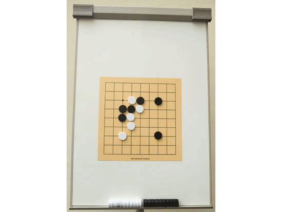 Demobrett mit magnetischen Go-Steinen (s/w) für die Einführung in das Go-Spiel vor größeren Lerngruppen.