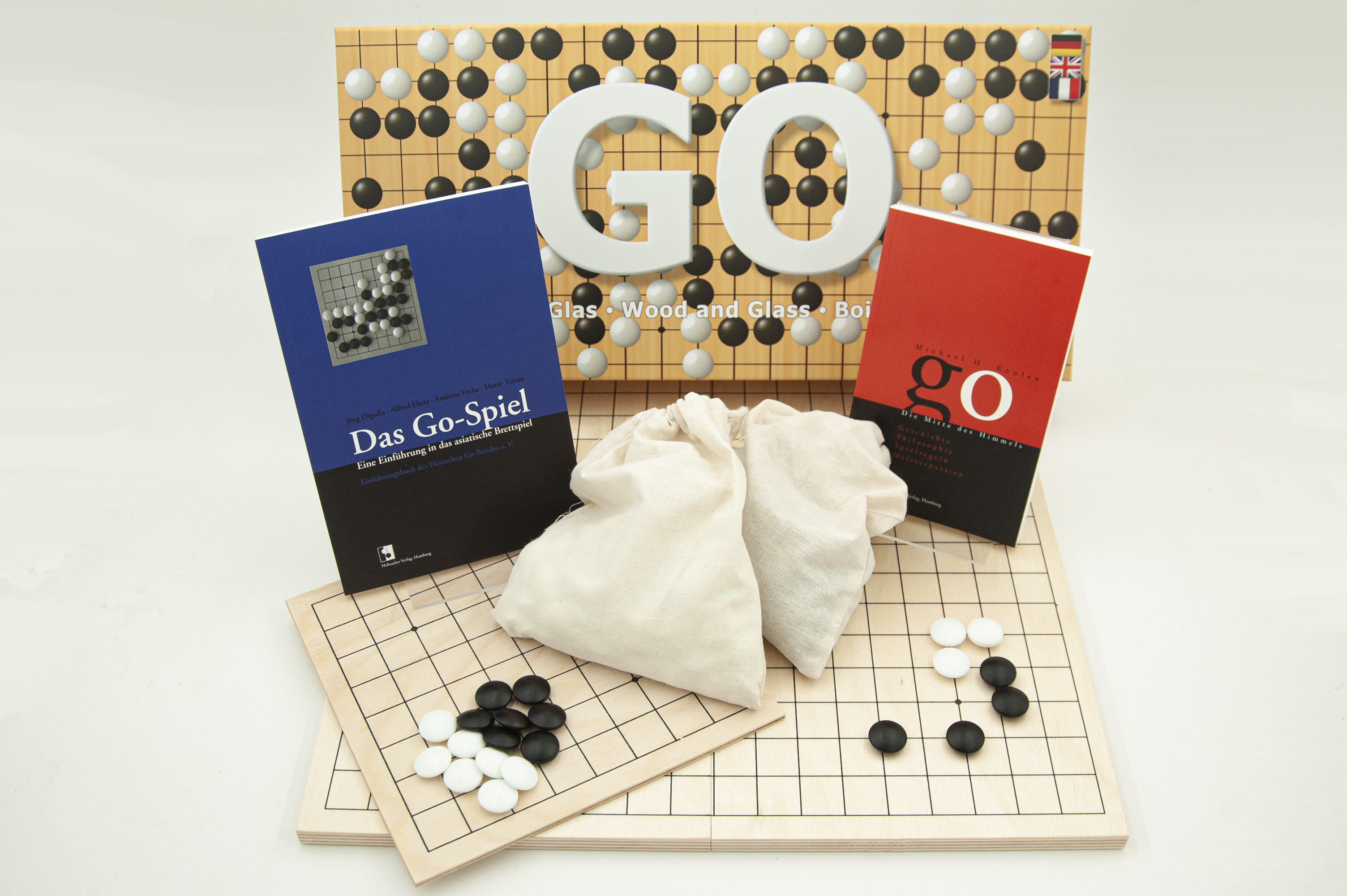 Unsere Go-Box enthält ein gut verarbeitetes 11mm-Holzklappbrett (12-br014) aus Multiplex Birke, 2x160 8mm-Glassteine (12-st005) sowie ein dreisprachiges Regelheft (11-hv011)