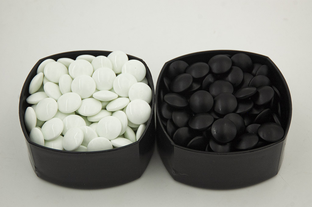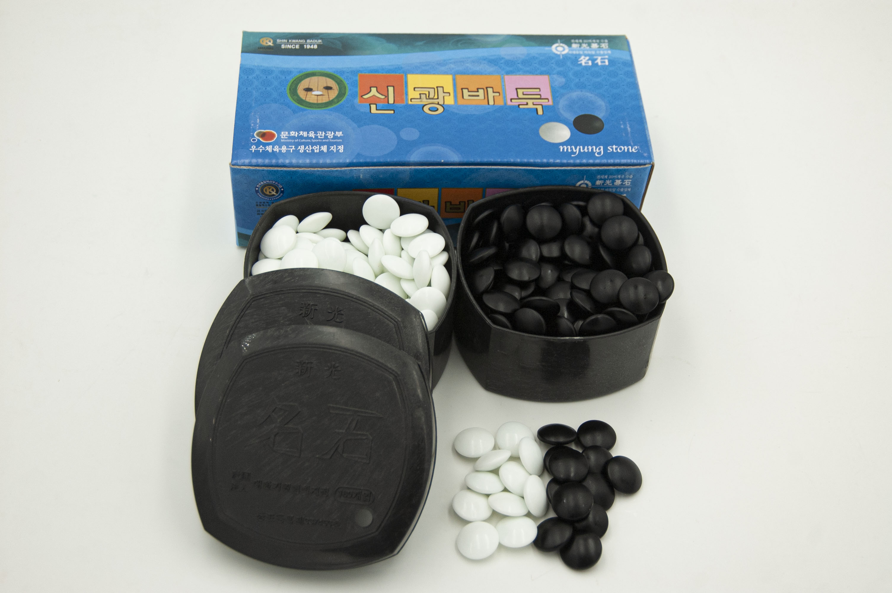 Diese koreanischen Glassteine, 8 x 20,5 mm, haben einen etwas geringeren Durchmesser als die üblichen 21,5mm-Steine. Außderdem verfügt ein Satz statt der üblichen 180 Steine nur über 160 Steine je Farbe. Da aber die überwiegende Mehrzahl aller Go-Partien weniger als 300 Züge lang ist, kann diese Anzahl durchaus als ausreichend betrachtet werden. Diese Steine überzeugen durch gute Qualiät, werden in einer Platikbox geliefert und haben einen attraktiven Preis.