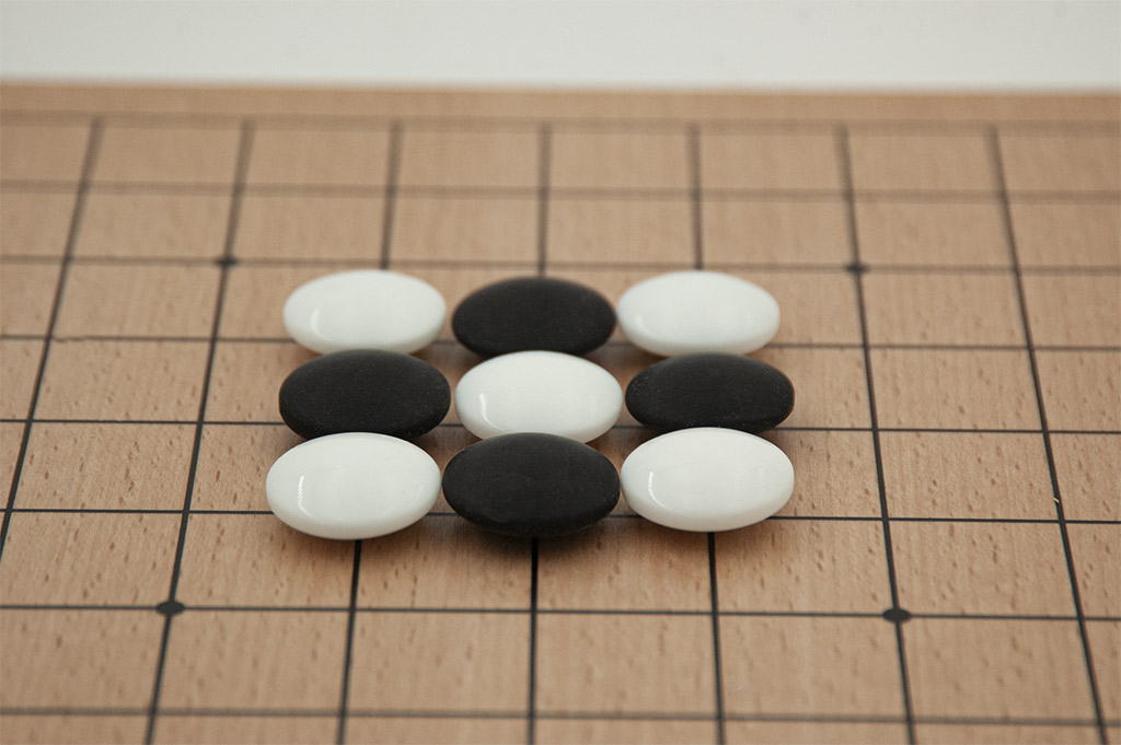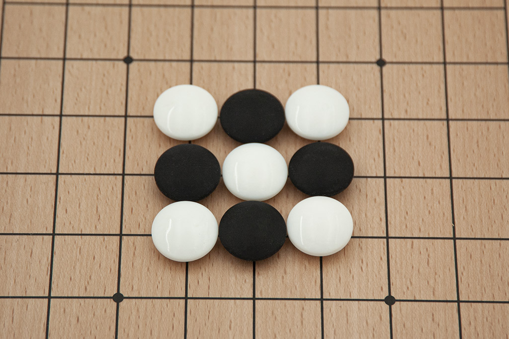 Form. In meiner großen Stichprobe gab es nur ein paar deutlich größere Steine (10mm) und nur einen einzigen deutlich kleineren (8mm). Diese Größe finde ich als Anfänger genau richtig, wird oft empfohlen und wohl auch gerne auf Turnieren verwendet, viel dünner sollte es nicht sein, etwas dicker für Liebhaber. Vorher hatte ich zu kleine Steine (20mm Durchmesser), sodass auf dem Brett deutlich sichtbare Lücken zwischen den gesetzten Steinen blieben. Das ist nun nicht mehr der Fall, die Steinketten erscheinen schön zusammenhängend.