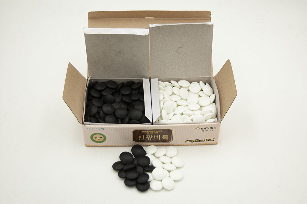 Diese koreanischen Glassteine, 9 x 21,5 mm, sind von ansprechender Qualität und bieten ein gutes Preis-Leistungs-Verhältnis in Bezug auf die Anschaffung von Go-Steinen. In einem Satz befinden sich 180 Steine pro Farbe (+/- 5 Steine).