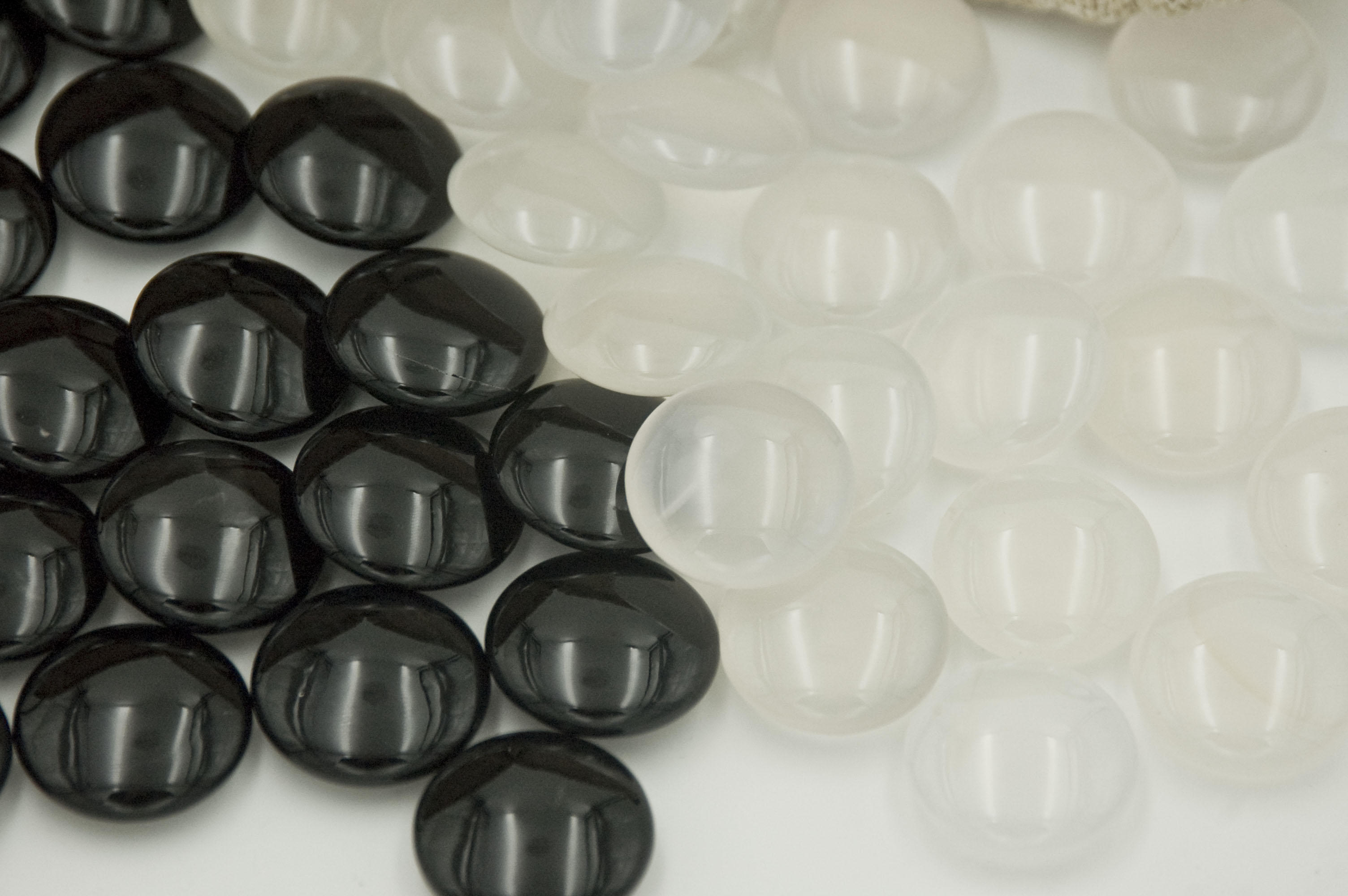 Diese Go-Steine sind aus dem Halbedelstein Achat gefertig und haben die Maße von 7 x 21,5 (Höhe x Durchmesser). Die schwarzen Steine glänzen Edel, die weißen Steine sind leicht transparent. Beide Sorten haben eine sehr glatte Oberfläche und liegen, ähnlich wie Schiefer- und Muschelsteine, sehr angenehm in der Hand. In einem Satz sind 180 Steine pro Farbe (+/- 3) enthalten.