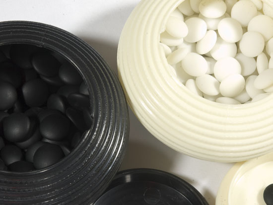 Hinweis: Schwarze Go-Steine sind in der Regel matt und können beim Transport leicht zerkratzen. Daher werden sie bei der Herstellung leicht eingeölt oder eingepudert, um sie gegen solchen Schäden zu schützen. Durch Reinigen der Steine mit Wasser oder einem feuchten Tuch können der Ölfilm oder das Puder leicht entfernt werden. Scharfe Reinigungsmittel sollten (insb. bei Schiefersteinen) nicht verwendet werden.