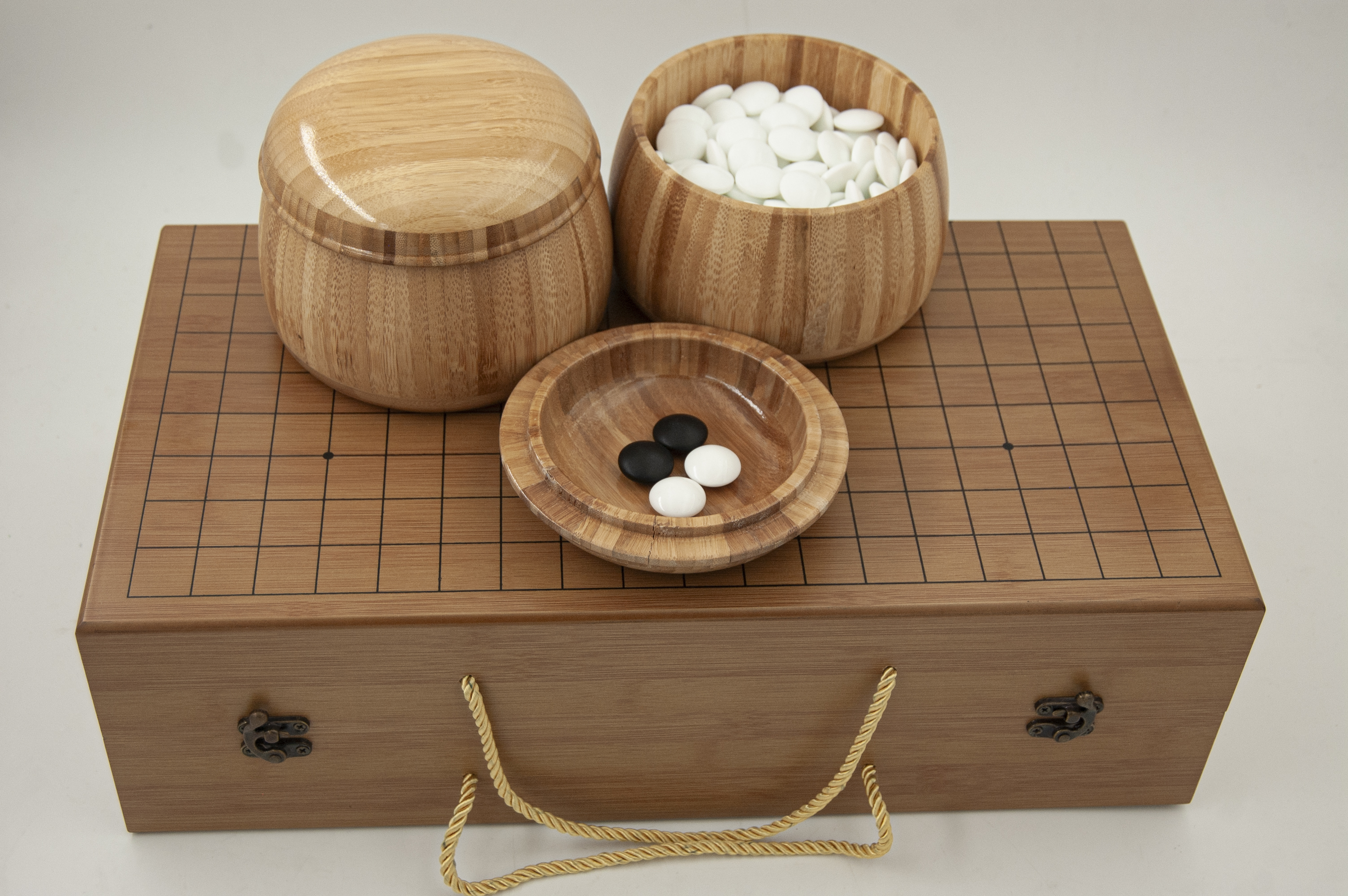 Praktische Box mit 19x19-Brett, in der man zwei Baumbusdosen inkl. Steinen verstauen kann