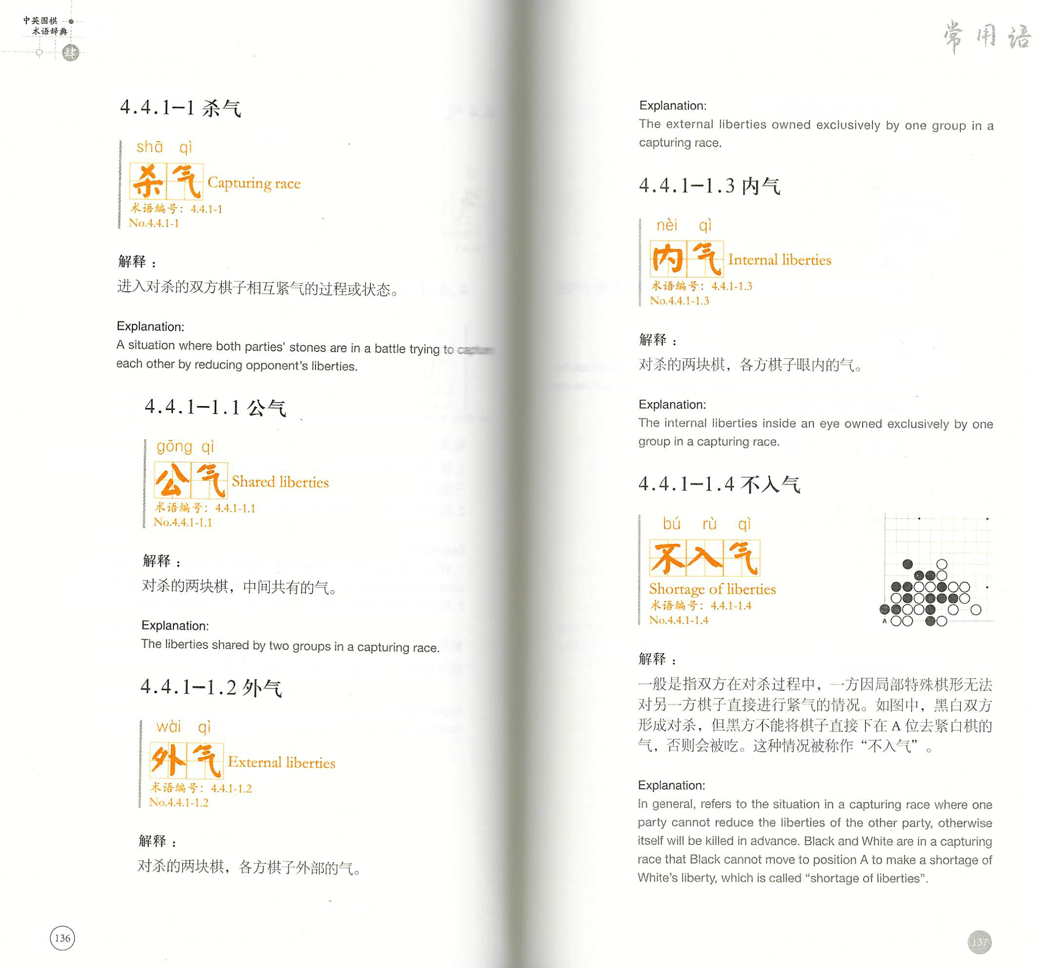 Dieses Wörterbuch enthält 643 Begriffe in sechs Kapiteln: "Bewegungen", "Techniken", "Gebräuchliche Redewendungen", "Formen", "Regeln" und "Sprichwörter". Der Inhalt umfasst den chinesischen Begriff und Pinyin, den englischen Begriff, die Definition, eine Erklärung und ein Diagramm. Nach Angaben der Chinesischen Weiqi-Vereinigung mit der Erstellung des Wörterbuchs im Jahr 2013 begonnen und es dauerte sieben Jahre bis zu seiner Fertigstellung. Es wurde auf dem Welt-Weiqi-Gipfel in Rizhao, China, im Jahr 2019 testweise eingesetzt und fand großen Anklang. Dieses Wörterbuch ist das erste seiner Art, das auf staatlicher Ebene in China veröffentlicht wurde (People's Publishing House) und soll als Instrument und Brücke zur Förderung der Weiqi-Kultur im Ausland dienen.