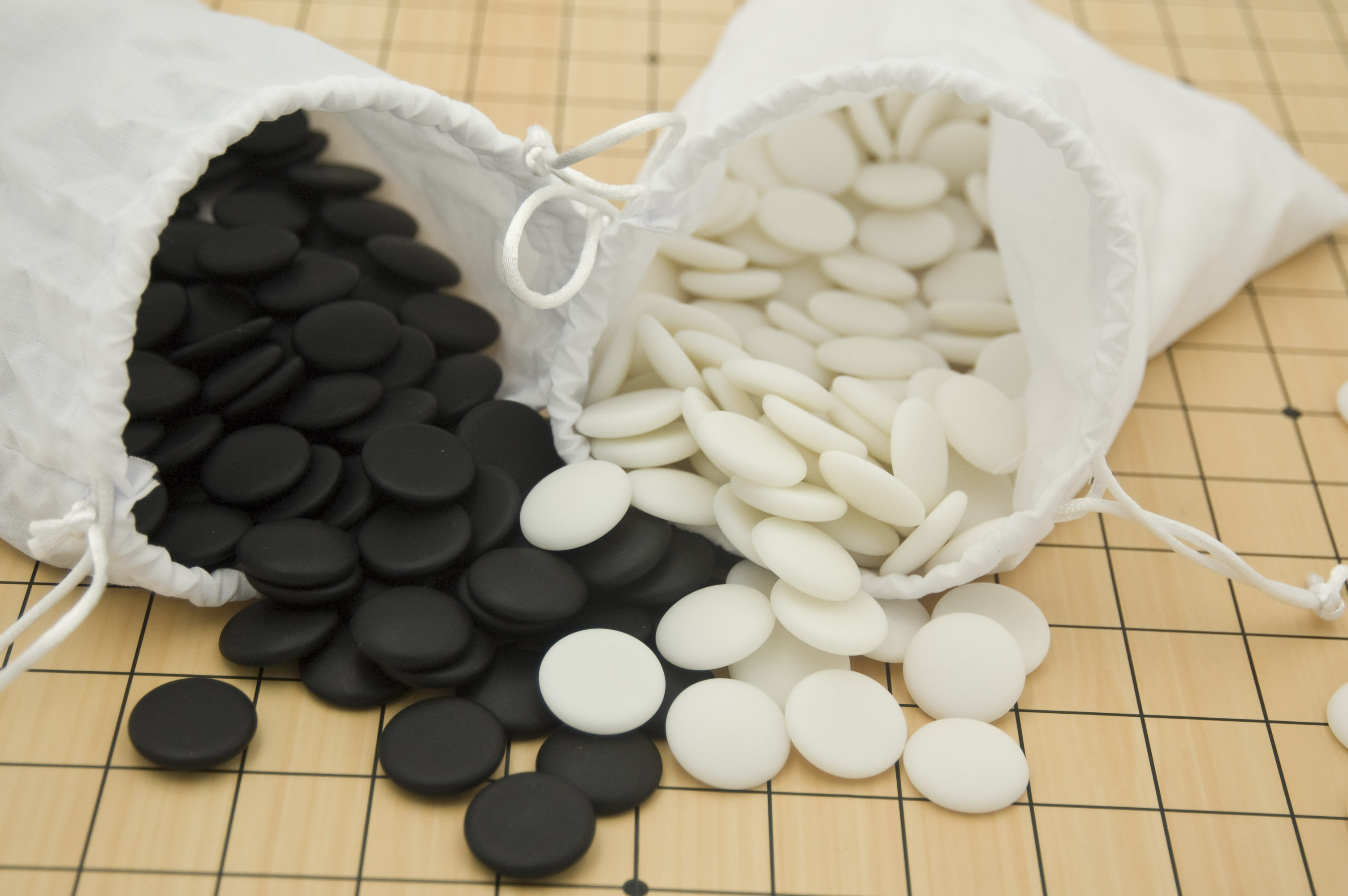 Go-Set mit einem 19x19-Brett aus Karton mit einem kombinierten 13x13/9x9-Brett auf der Rückseite und 2 x 180 Kunststoffsteinen im Stoffbeutel in einer praktischen Schachtel.
