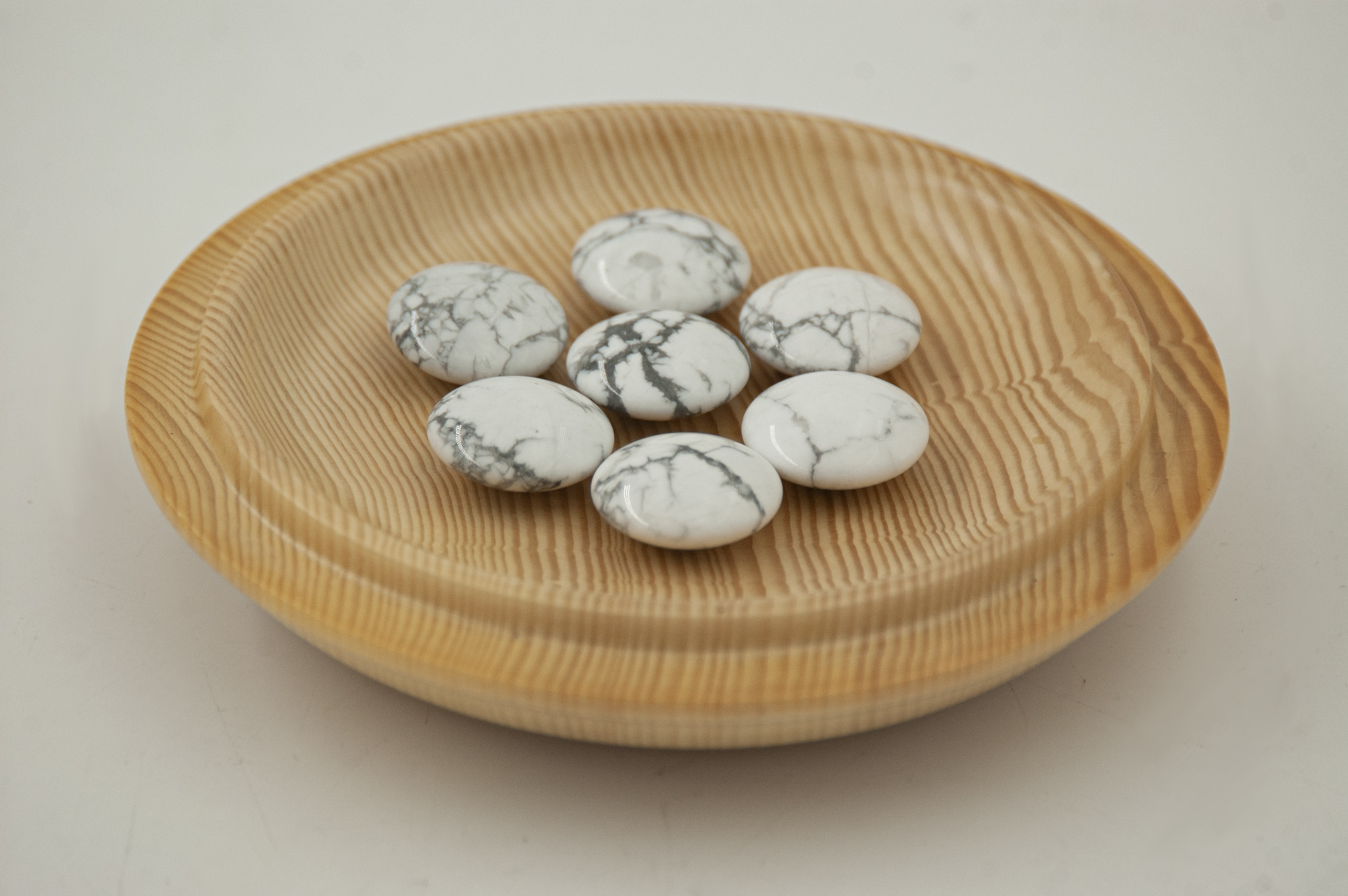 Turquoise, zu Deutsch Türkis, ist normalerweise blau bis grün und kann verschiedene Farbnuancen und Muster aufweisen, darunter Matrix (Muttergestein), schwarze Einschlüsse und andere. Es gibt jedoch einige weiße Varianten, die als "White Turquoise" (Howlith) bezeichnet werden. Es handelt sich dabei um eine Variation von Türkis, die weniger Sättigung in Bezug auf die charakteristische Blau- oder Grüntönung aufweist.